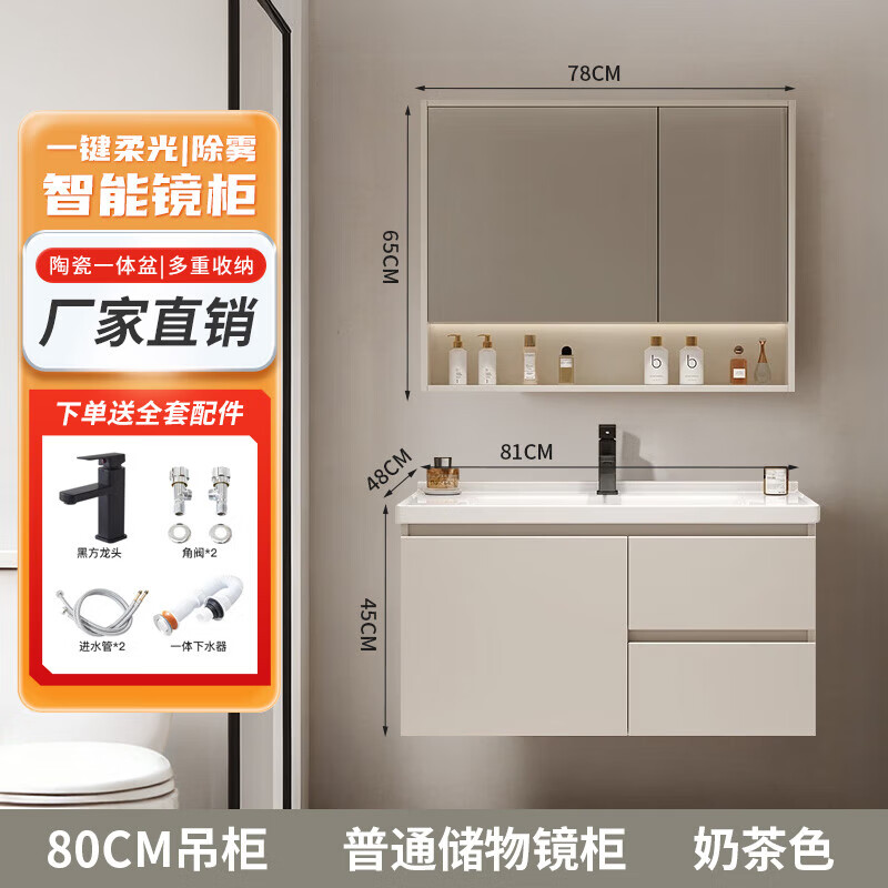 顾家家居浴室柜陶瓷一体盆卫生间洗脸手盆柜组合镜柜奶油风洗漱台G-06753 奶咖色美妆镜柜80cm
